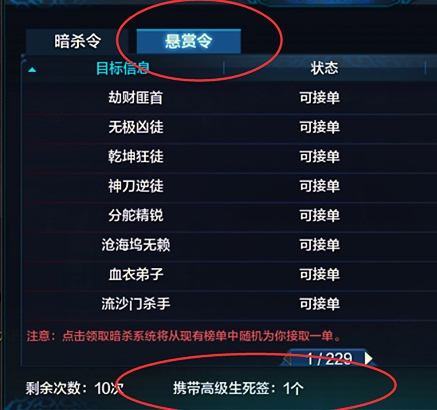 到达暗杀情报板后,点击就会出现下图,选择悬赏令,如下图,直接点击领取暗杀,然后就会扣除次数以及扣除生死签。在暗杀情报板上还有暗杀令这个选择,暗杀令就是对对玩家的暗杀,杀手接取之后,可以,杀死目标玩家会得到发布暗杀玩家的金钱。