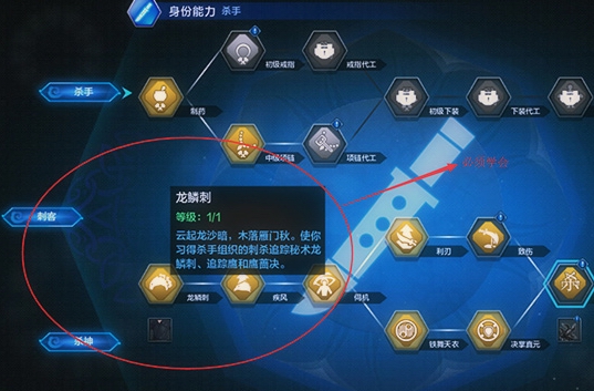 选择杀手身份之后学会龙鳞刺(会自动学会鹰蔷诀和追踪鹰),此时并不消耗任何身份历练。