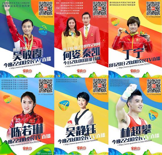奥运期间短短的17天,全民TV签下了包括吴敏霞、何姿、秦凯、陈若琳、丁宁、吴静钰、林超攀、陈佩娜、刘湘、王一梅在内的十几名奥运明星,阵容豪华,奥运明星数量上超越其他直播平台,分量上也显得尤为关键——闭幕式中国旗手“大魔王”丁宁、奥运现场上演求婚的秦凯何姿、跳水女王吴敏霞等等,无一不是话题焦点人物。
