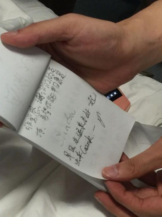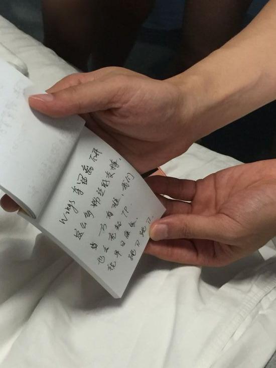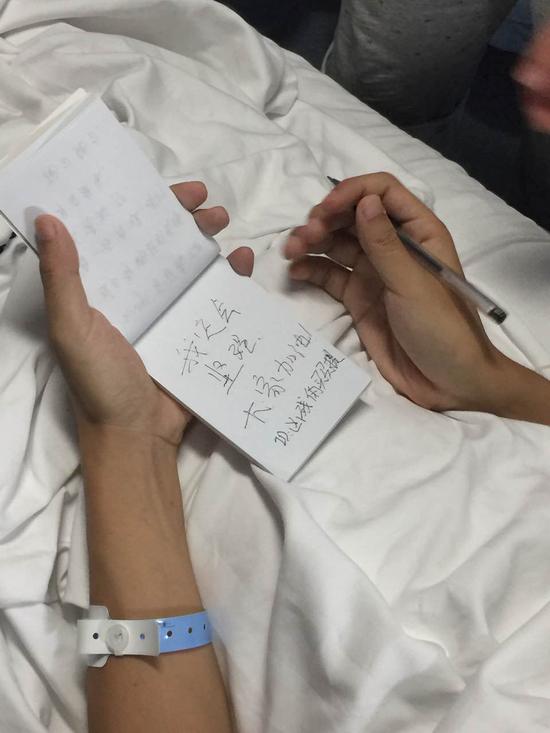 由于担心病菌通过空气传播到病人,所以队员们都戴上了口罩,以写字的方式与范皓越交流。