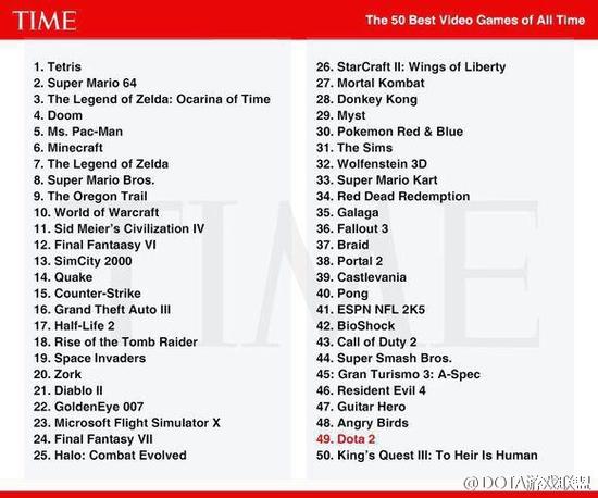美国时代周刊评选出历史50佳游戏,俄罗斯方块排名第1,DOTA2入榜排名第49。榜单详情: