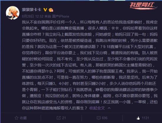 在得知自己再次被质疑代打的时候,卡卡没有选择妥协,而是在微博中和西门刚正面,更是邀请西门参加之后的平台主播挑战赛,要两人在线下一决高下而不是在直播中打嘴炮。根据卡卡的微博,这位被西门称之为代打的女主播曾在线下与国服第一狮子狗展开了对决,不仅没有变成被抓哭的韩国女主播,那位国服第一狮子狗更是对她的技术赞誉有加。看她直播的观众们通常也有卡卡怎么可能这么强的想法,但直播之中卡卡一直坚持露手直播,和小智等人的车队中也起着大腿的作用,因此玩家们也就逐渐打消了对于卡卡是否代打的疑虑。