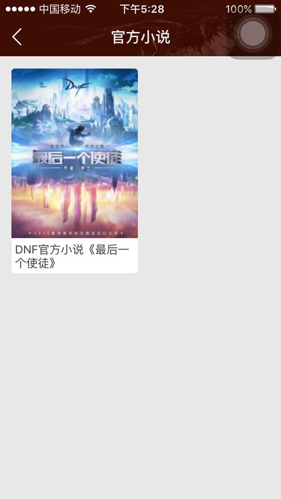 在DNF分区的娱乐版块中,小说频道可以给广大用户提供由卷土执笔的DNF官方小说《最后一个使徒》的最新鲜的更新。此前, 《最后一个使徒》已于7月23日在DNF官网、起点中文网、创世中文网、QQ阅读全网首更,广大DNF爱好者在追更的过程中往往因为不能及时通过以上途径 看到第一手的更新内容而苦恼。现在掌上TGP的小说频道就能解决玩家的这些困扰。打开手机,进入DNF分区的小说频道就能看到《最后一个使徒》的每日更 新,再也不用担心错过精彩的故事了。