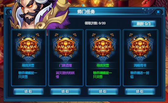师门任务每天前20次会刷出不同品质的任务,根据白、绿、蓝、紫品质越高奖励越高。