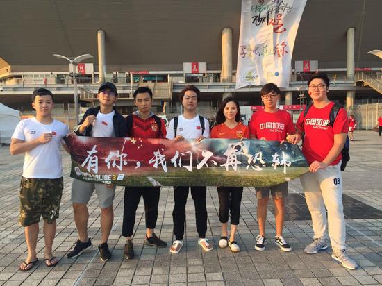 来首尔已经一星期了,对这里的交通状况再了解不过,为了避免拥堵,FIFA Online 3看球团赛前4个多小时便从酒店出发前往球场。客队看台位于球场北侧,在北看台外,几位职业玩家展开事先准备好的“有你,我们不再恐韩”的横幅合影留念。 这一横幅也吸引了不少旁边的中国球迷前来一起合影,看到横幅上的FIFA Online 3标志,有的在韩国留学的中国学生甚至兴奋地表示:“我们平时也玩这个游戏!”据了解,后来这一合影还出现在了韩国媒体的报道中。