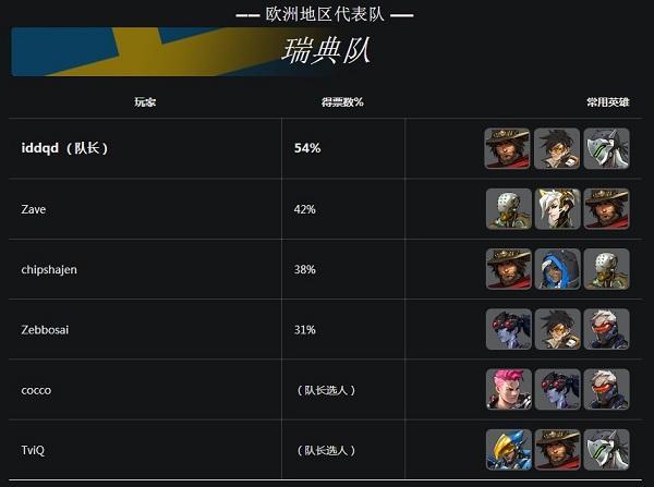 从名单可以看出这届瑞典队的队员分别是iddqd(队长) Zave chipshajen Zebbosai cocco(选人) TviQ(选人),如果不太熟悉守望先锋欧美情况的玩家可能只认识TviQ或者谁都不太了解。现在小编分别给大家介绍一下瑞典队的每个队员。