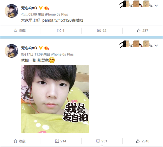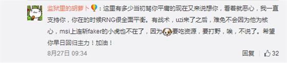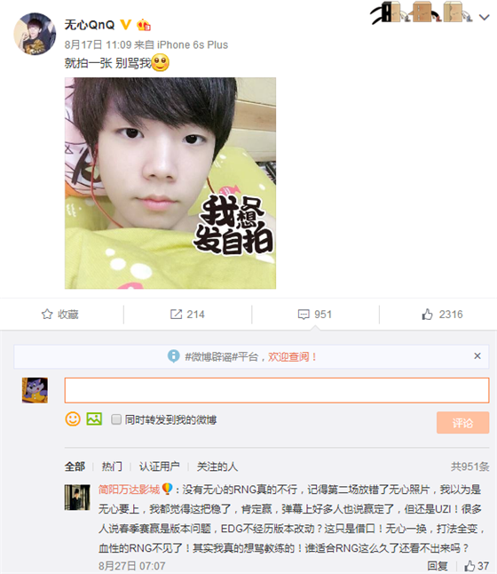 今早9点,RNG替补AD选手无心在时隔半个月后,首次在微博发声。当然,也仅是一条直播微博的通知而已。在RNG被EDG大比分击败而痛失冠军后,网友们就无心和Uzi谁更适合RNG的讨论也再度激烈了起来。当天比赛结束后,无数以“无心对不起”为主题的回复充斥着无心在8月17日发的这张自拍微博下面。