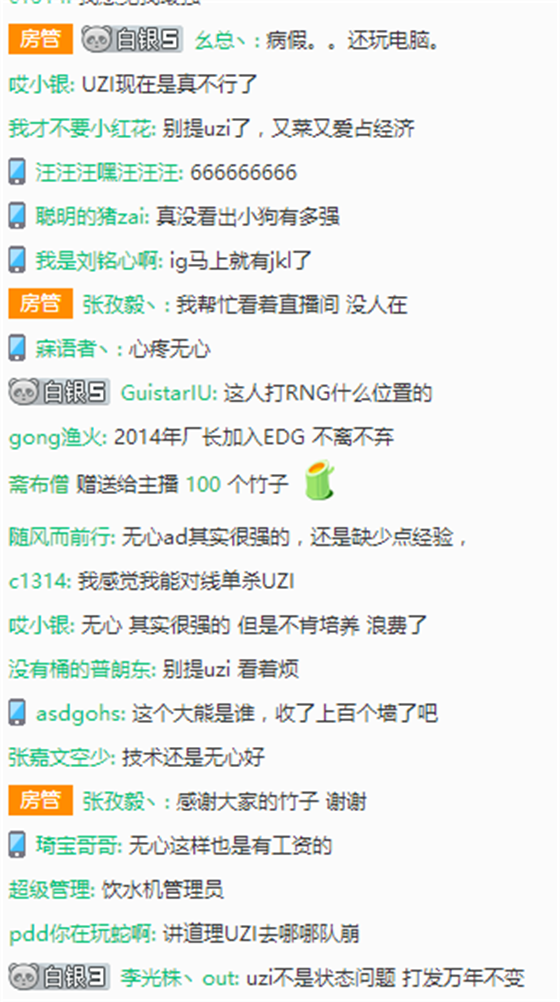 直播间的粉丝留言中,基本都在讨论Uzi和无心的地位问题