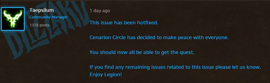 A:这个问题已经被修复了。塞纳里奥议会已经决定和所有人都和平相处。你现在应该可以接到任务了。如果你发现还有任何相关的其他问题,请告知我们。尽情享受军团再临吧!