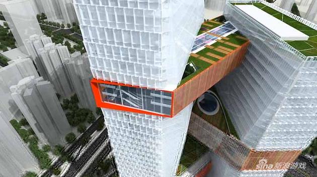 两栋大楼中间由悬空的连接桥相连,连接桥里面是茶水间、礼堂、会议室、展览厅,甚至还有一个 300 米的跑道。另外,楼内还有屋顶花园、泳池、攀岩中心,以及多个餐厅和冥想室。