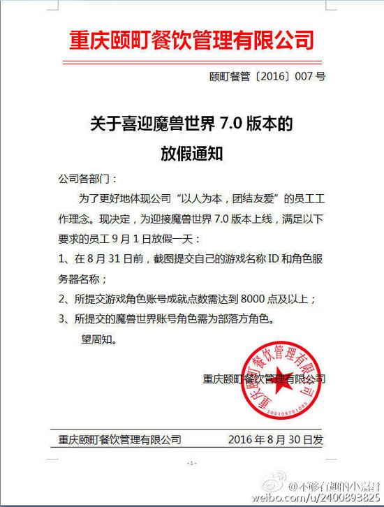 《魔兽世界》军团再临版本已经上线了,有不少玩家都选择辞职回家为艾泽拉斯战斗,当然也有热爱游戏的老板让员工放假。