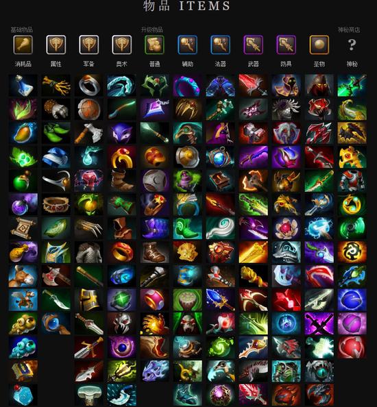 1、关于道具:dota的道具基本分为恢复品、基础属性装、功能道具、主动技能道具和面板道具;