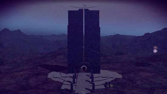 在两年前,《无人深空》的开发商就发布过一个预告,叫做“时空驿站试玩”,在youtube上大家都能搜索到。在下面的图片中能看到,玩家可以走进这个巨大的石头中,然后被传送到另外一个地方。所谓时空驿站是一种功能性建筑,它们只会在特定的星球出现,而且一个星球上会有许多小的时空驿站围绕着一个大的时空驿站。如果你穿过了这个建筑,,你将会被传送到另一个更接近星系中心的星球。