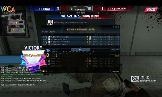 WCA2016资格赛S2在京激战正酣,今天进行的将是CSGO项目总冠军的争夺,由VG.CyberZen战队对阵Ehome战队,胜者将获得WCA2016世界总决赛的资格,最终VG.CyberZen2:0轻松击败Ehome夺得总冠军,晋级世界总决赛。
