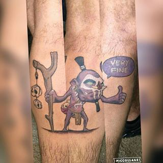 看到这个纹身,不得不说一个小故事,在A队获得TI3冠军之后,成绩一直不稳定,从曾经的世界冠军,一直沦落为欧洲鱼队。有一次A队参加一个比赛的欧洲预选赛,普遍不被看好,一个玩家在reddit论坛发帖嘲讽:"只要A鱼出线,我就纹一个A队标志!"此贴顿时炸开了锅,玩家们纷纷留言,有的认为这个赌注很保险,不会实现,有的A粉不服进行反攻,更多的是吃瓜群众不嫌事大留言坐等结果。也不知道是不是这个嘲讽激起了A队心里无穷的斗志,他们一路上过关斩将,顺利已第一名拿到出线名额。这位玩家也没有食言,比赛之后就直接去纹了一个A队标志在腿上,而且还不小。可能是他男子汉一言既出驷马难追的气魄感动了A队,A队出钱给他买了机票,旅店和门票,让他随同A队一起参加了比赛,全程可说是VIP级别的待遇,这位玩家也真的成为A队的脑残粉,可喜可贺,GGWP。