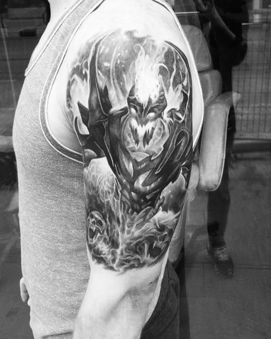 1. 国内纹身文化可以说还是比较保守的,国外相对就比较开放,可以把爱人的名字,孩子的名字,父母的名字或者对自己重要的人,事,物,名言纹在身上。能把一个游戏的相关内容纹在身上的,肯定都是真爱粉,但是纹的类型也是五花八门,先看看男性英雄: