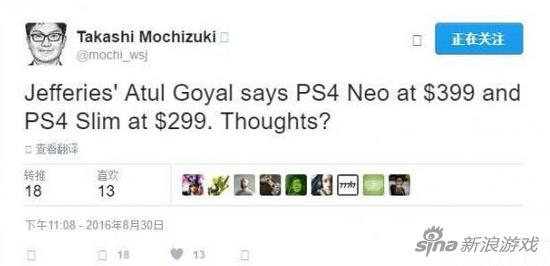 外媒的记者在Twitter上表示,他也是听他人说的,PS4 Slim价格299美元,而PS Neo售价399美元。