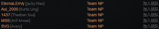 北京时间9月9日凌晨,一支名为NP的战队成立了,里面的成员包括了秘密原主力成员EE、Aui_2000以及1437,另外则有来自原EG战队的SVG和13年曾经加入过EG的MSS。