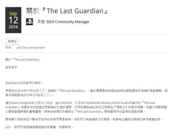 在PlayStation官方博客上,吉田修平先生发表博文称《最后的守护者》将再次延期,新的发售日为2016年12月6日,欧版为12月7日,英版为12月9日。