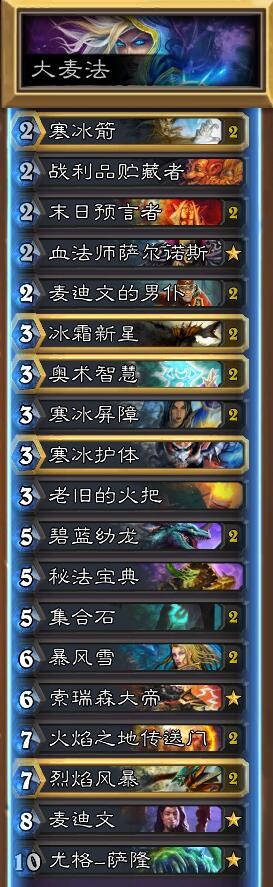 卡组体系很立体,奥秘-男仆-末日-冰环-集合石/鸡腿杖-高费法术-尤格萨隆,唯一的缺点是比较被动,但是冰箱翻盘的快感总是让人欲罢不能。