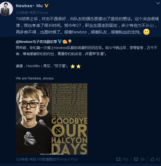 Newbee官方发文正式宣布Hao与Mu的退役,Mu随后进行了转发并感慨了自己的职业生涯。