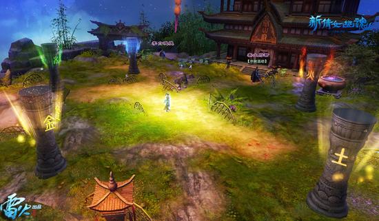 “咏月祈福”玩法中,玩家将帮后羿破除王母布下的障碍,助他和嫦娥团聚。玩家需要先放飞孔明灯并上天空摘取月饼,然后进入天兵天将的五行阵。五根石柱对应“金木水火土”五行,按照其相生相克的规律排布,按照不同顺序打开,可使打怪获得伤害加成或降低。切记谨慎选择!