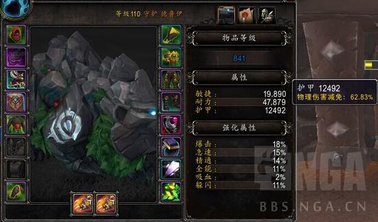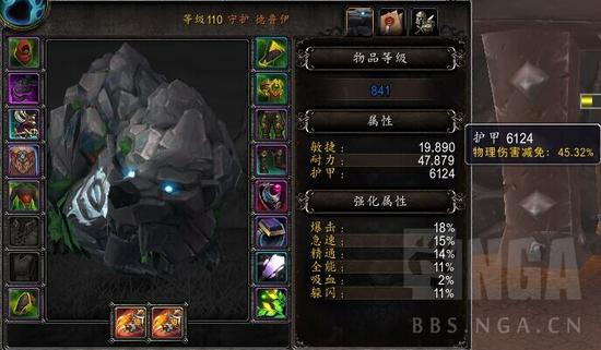 下面来谈谈铁鬃。铁鬃在神器增加1.5秒持续时间的支持下,持续7.5秒(在天赋的支持下可以更长,由于我选的减少树皮cd的天赋,在这就不讨论了)。需要45怒。也就是6怒/秒。而基础怒气获取为7.05怒/秒,加上第一层天赋的额外怒气(只要点的不是刺藤)。相当于大概100%的铁鬃覆盖。乌索克的印记45怒持续7.5秒,和神器加强过的铁鬃的时间一样。下面的问题是100%的铁鬃覆盖是多少物理免伤呢?来看3张图。在没有加强神器特质(铁鬃额外护甲)的情况下: