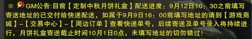 剑网3公告目前[定制中秋月饼礼盒]配送进度:9月12日10:30之前填写寄送地址的已交付给快递配送,如属于9月9日16:00前填写地址的请 到[游戏商城]-[交易中心]-[周边订单]查看快递单号,后续寄送及单号录入将持续进行,月饼礼盒寄送截止时间10月1日0点,未填写地址的侠士切勿错 过!