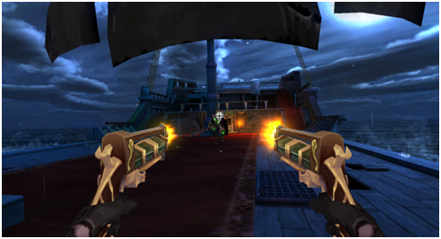 《骷髅海》是首款结合了创新VR海战与FPS射击的游戏。玩家操纵战船前进的同时,通过VR的特性使用头部视角来瞄准,指挥船首、左右船舷的不同武器,在不同的角度向敌人发起攻击。而在与敌船接舷时,亦可以拔出身上的弯刀火枪,面对冲向甲板的敌人大开杀戒。结合VR设备的创新操作方式,让玩家体验到从未有过的沉浸战斗、操作体验。