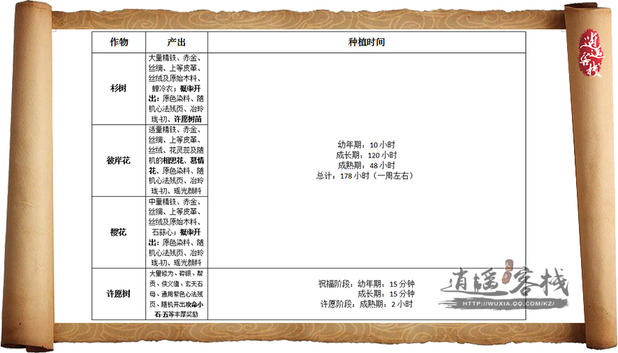 新的家园玩法终于在沉寂了半年之久后的开学季迎来了春天,小编作为休闲玩家表示灰常的期待。特别是本期要侃的家园种植。在这里游侠们表示,天刀的世界里药材的获得渠道终于不只是靠那一铲子的垄断,而且还有农夫玩家辛勤的双手。首先小编先老生常谈说一说家园种植玩法的步骤给萌新们科普,所谓种植顾名思义即利用手中的各种作物种子产出不同的作物。本次开放的种子类型为3种类型,经济类、景观类、许愿类;分别为杉树、彼岸花、樱花、许愿树。产出如下: