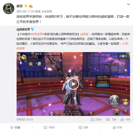 雷军表示,剑侠世界手游目标:向剑网3学习,绝不出售任何能力相关的虚拟道具,打造一款公平的手游世界!