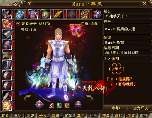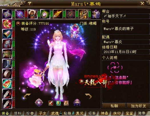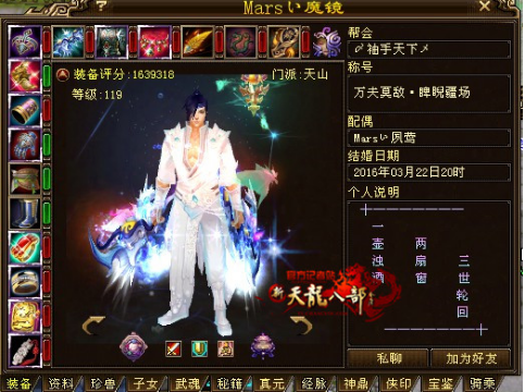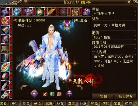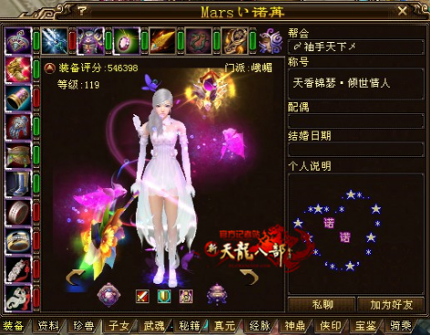 门派配置2天上2逍遥1丐帮1武当1唐门1星宿2峨眉,可以算是集合了天命最强大的号,