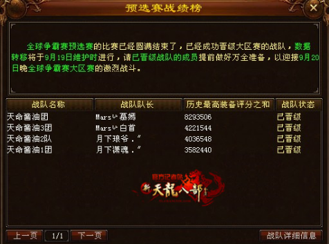 此次全球争霸赛出线晋级的战队分别是天命酱油团战队、天命酱油3团战队、天命酱油2队战队、天命酱油1团战队,