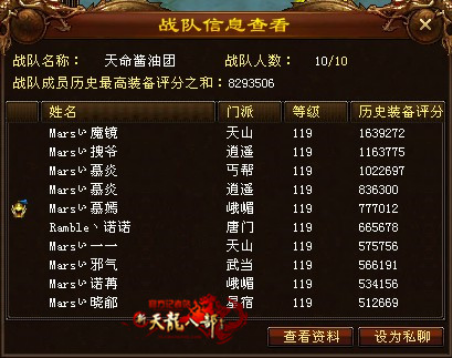 第一支出线战队从历史最高装备评分来看,可见配备了最高评分的号,包括第一天山、第一逍遥、第一丐帮,甚至峨眉也实力不俗,