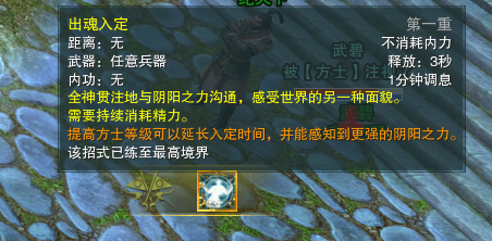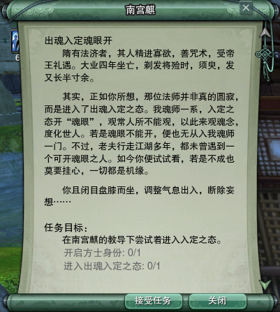 这个任务就算是对于方士的初步教学了,教我们如何开启使用方士。我们接了任务之后只要打开江湖百态界面,然后选择方士并且开启方士身份,然后点击右下角出魂入定进入入定模式: