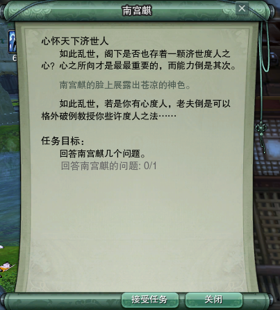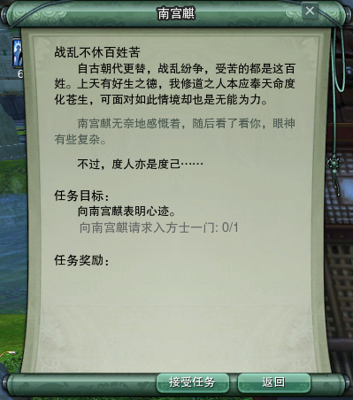 点击发现挖宝完之后我们的任务就完成了,然后回去找南宫麒交任务,交掉之后可以接到最后一个任务,只要对话交掉即可:
