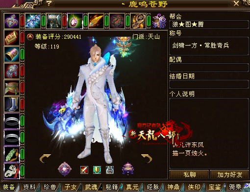 鹿鸣:我比较喜欢打架,所以打手类的门派比较喜欢,况且当时听他们说天山的暴击高,而且最关键的是可以隐身啊,所以毫不犹豫选择了天山。