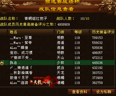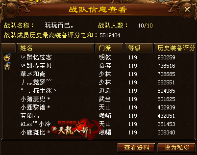 第二支出战的战队玩玩而已,从名字上看,大家似乎只是重在参与,那么能以第二名的实力成功晋级,那可不只是玩玩而已才能打拼出来的哦。那么这支战队的布 署情况是如何的呢?从图中我们明显可以看到,天山是每支战队的首选,然而对应的是,两个峨眉也成了必须携带的人工加血机,少林众所周知外防很高的,耐打性 强悍,看来在战队的布署上队长是花了一番心思了。其次慕容武当和逍遥从评分上明显看的出也不是吃素的,那么就期待这次的较量能更加的激烈与精彩吧。