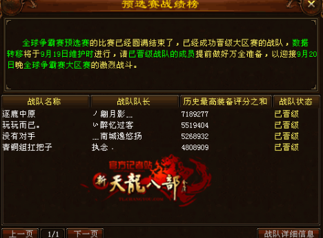 如图所示,本区已经成功晋级四支队伍,分别是逐鹿中原战队,玩玩而已战队,没有对手战队,青铜组杠把子战队