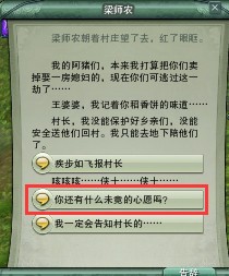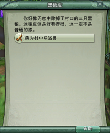 7、继续主线做到梁师农,问他是否还有什么遗愿,然后接取任务,回去的途中,打掉精英怪黑狼,拿到狼皮,右键接取任务。