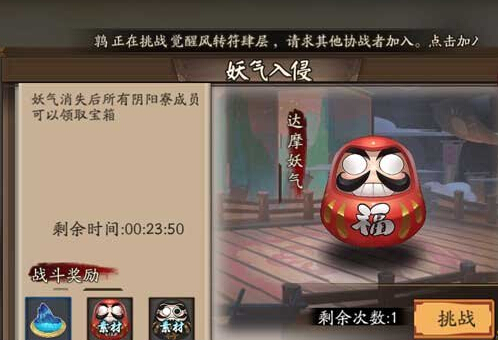 每天12:00-12:30、20:00-20:30,在公会鸟居附近会出现一个妖气副本,单人挑战,只有一次机会。