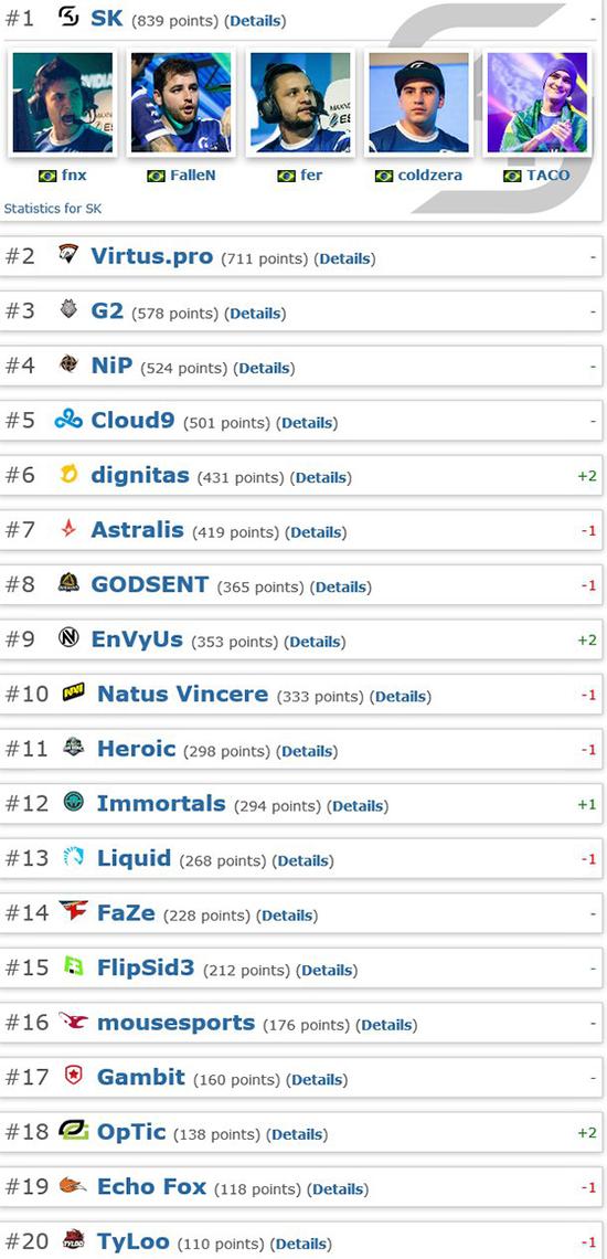 近日,海外知名CSGO网站放出最新一期战队世界排名,收购了原巴西LG的SK依旧高居榜首,刚刚夺得DH布加勒斯特站冠军的VP位居第二。