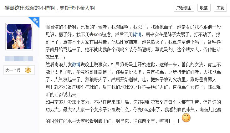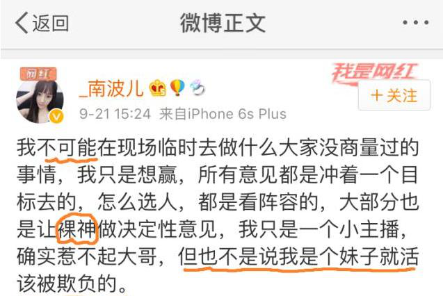 事情大致的经过就是,明星主播对抗赛的时候,全民主播队里的孙悟空本来是打上单的,结果南波儿强行抢了上单位,让猴子去辅助,结果孙悟空昨天在直播中对南波儿破口大骂。于是大批粉丝到南波儿直播间及微博带节奏,一时间,昨天清一色夸赞南波儿的评论,瞬间被“心机婊”充斥。而这件事自然也是传到了南波儿的耳朵里,南波儿在微博中刚了回去。