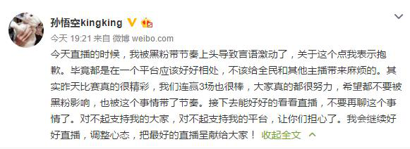 或许是认知到事态的严重性,而且毕竟两人同属一个平台,于是孙悟空在微博率先对自己的不冷静进行了道歉,而南波儿也选择删除了之前的微博。