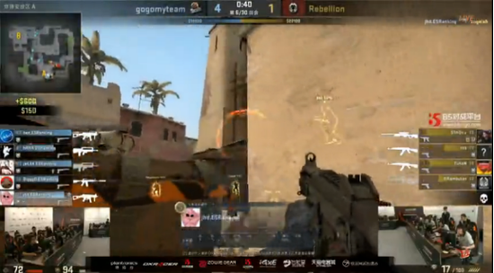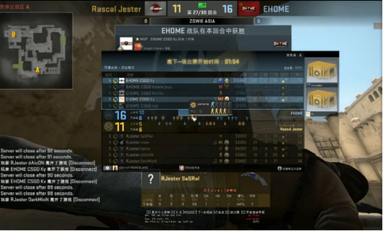 来上上半场第一把长枪局,Rjester似乎是意识到了Ehome的进攻意图,将比分顽强的扳回一分。而在随后的比赛中,你一分我一分,双方打起了经济消耗战。Ehome持续的胜利压制着,而Rjester无奈只有每局保枪或者被全歼。上半场作为T方的EHOME以10:5领先