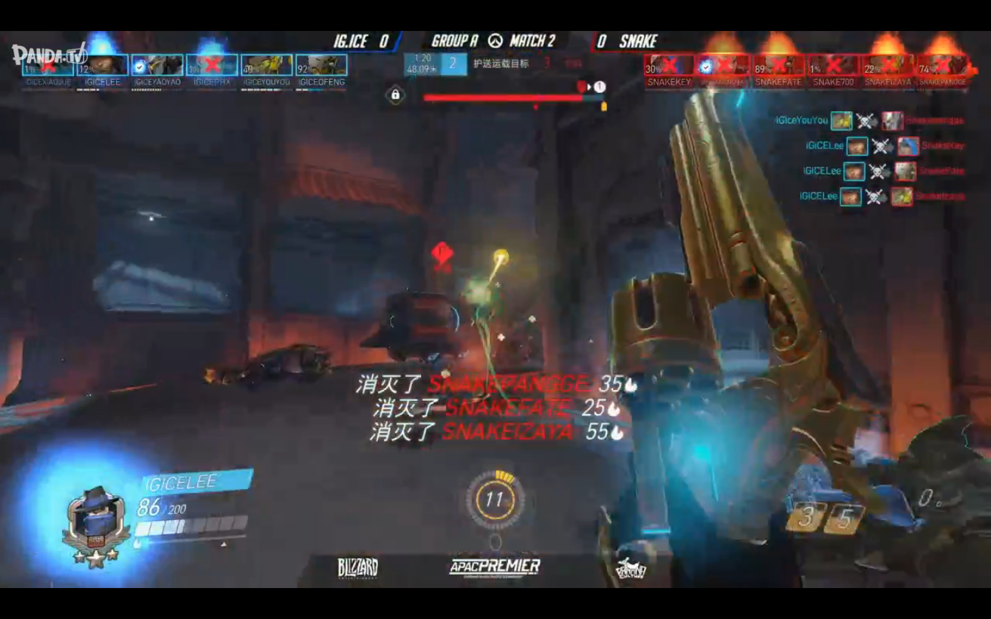 双方互换攻防,IG.ICE进行防守,Snake进行一个进攻。IG.ICE选择了小美、禅雅塔、毛妹、死神、卢西奥和大锤。而Snake选择了死神、禅雅塔、大锤、毛卢西奥和麦克雷。虽然IG.ICE小美冰墙有效分割了对方前后排,但Snake死神加毛妹一个双杀一个开大四杀,成功占下A点。Snake是获得了第一场的胜利。