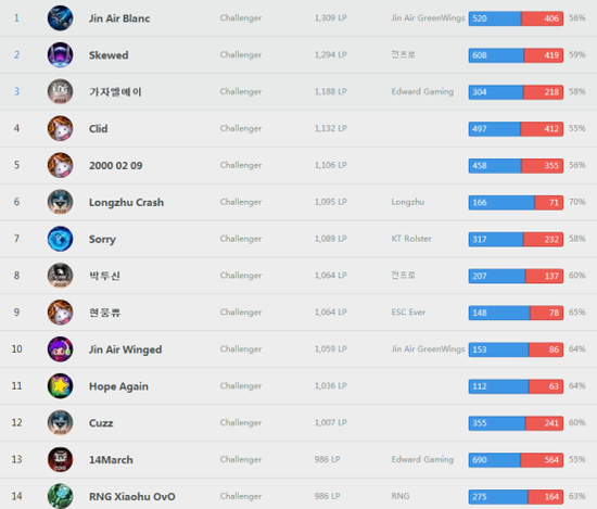 再看看韩服的玩家排名,大量职业选手汇集于顶分段,与国服形成了鲜明反差。此外笔者还翻看了欧服,美服,台服,包括外卡赛区的日服,巴西服,他们的画风都比较正常。
