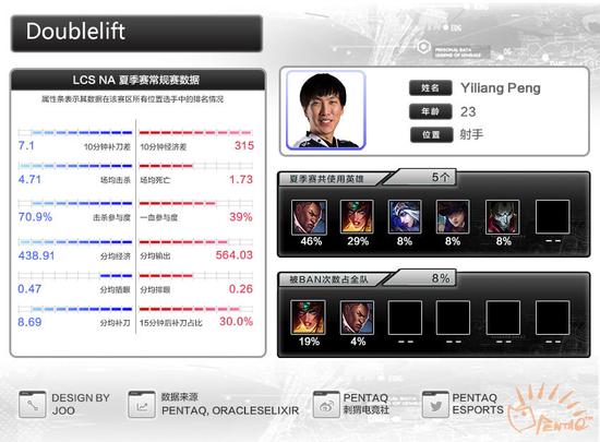 常规赛中由于TSM的场均比赛时间相当短,因此Doublelift的输出数据并不漂亮,不过我们仍旧可以从场均击杀看出他的Carry能力,在季后赛中,他的DPM上升到了647点。个人操作依旧出众,在季后赛决赛第四场中更是用卢锡安打出了力挽狂澜的表现。而他本赛季的失误相比上赛季大幅降低,这也是本赛季Doublelift提升相当大的一个点。