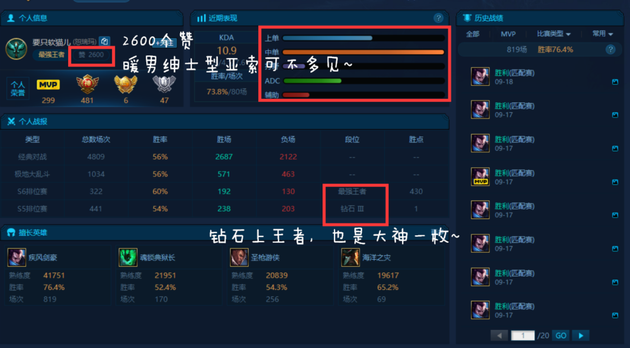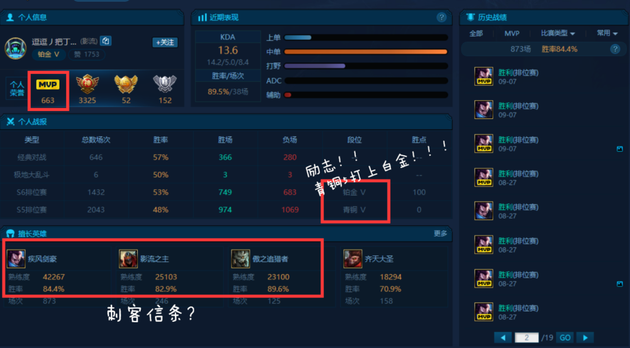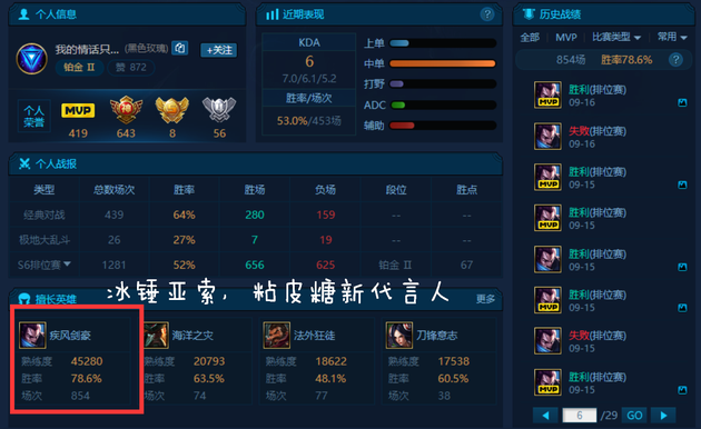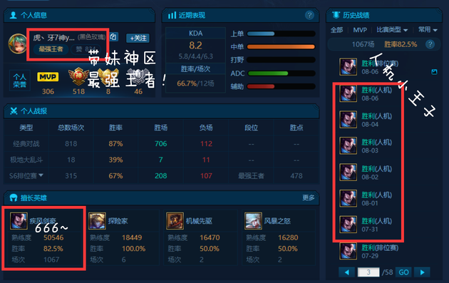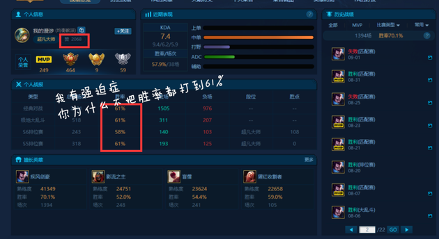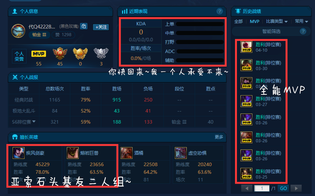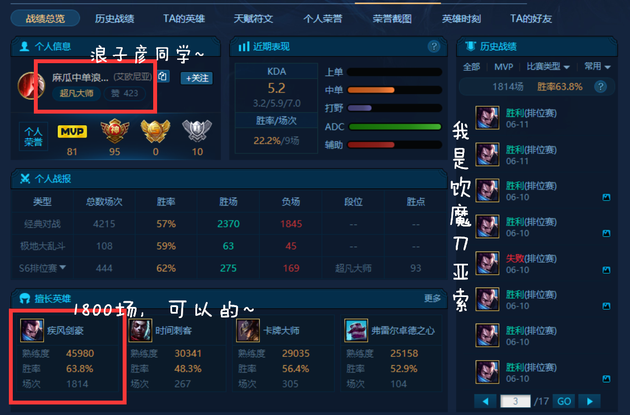 可以看到这是一位带妹神区的主播,对亚索有着狂热的追求,连人机都每把选上亚索同志,话说真的不无聊吗?另外可以发现打野是这位玩家的短板,一把都没有打过,不过术业有专攻,国服第一亚索也学就是靠着这份毅力取得的!
