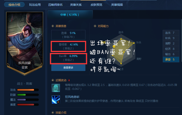在国服统计数据中,亚索以4.14%的出场率荣登亚军(猜猜看谁是第一)!然而BAN选率也以6.99%排名探花!如此高的PICK、BAN率让亚索无愧于是国服最受欢迎的英雄!